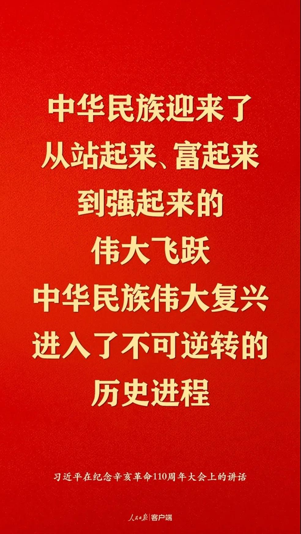 今年是辛亥革命110周年,是中国共产党成立100周年,中国人民正意气风发向着全面建成社会主义现代化强国的第二个百年奋斗目标迈进。在这个重要时刻,我们在这里隆重集会,缅怀孙中山先生等革命先驱的历史功勋,就是要学习和弘扬他们为振兴中华而矢志不渝的崇高精神,激励和团结海内外全体中华儿女为实现中华民族伟大复兴而共同奋斗。