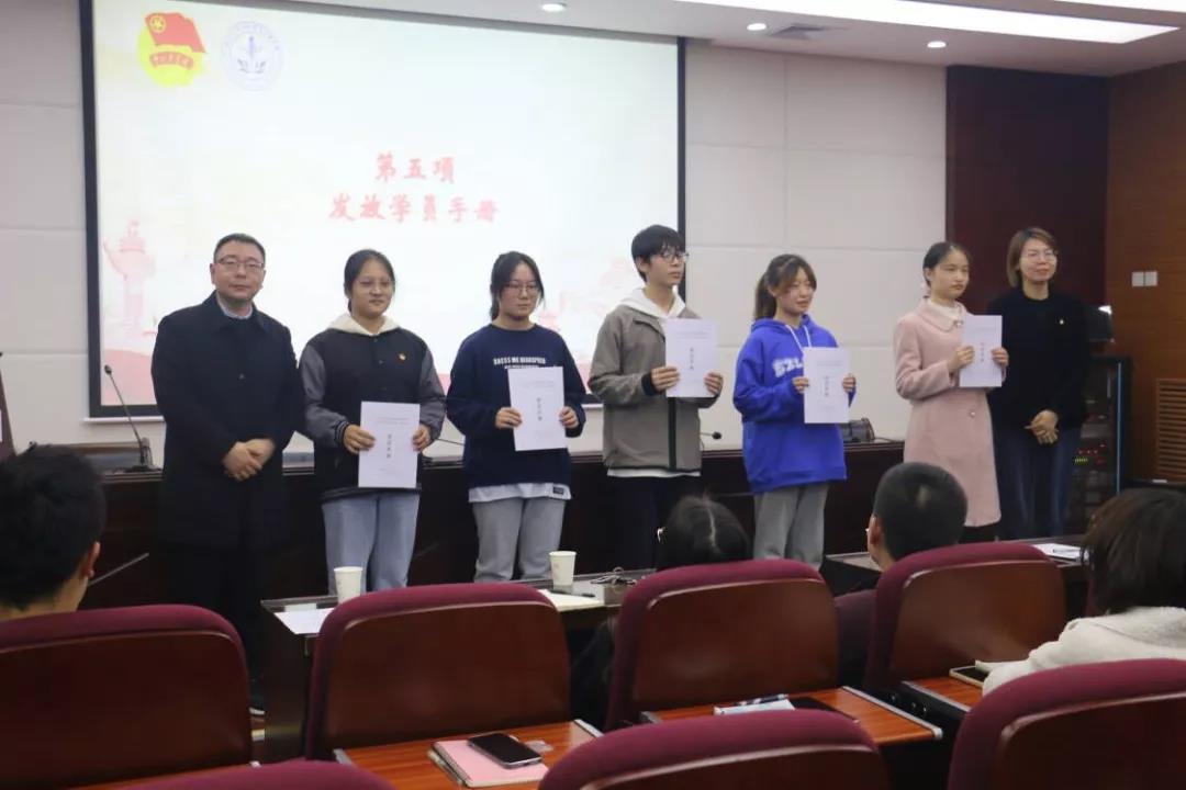 校团委副书记曹智和永利集团88304官网党支部(直属)副书记杨涛为学员代表发放了学员手册。