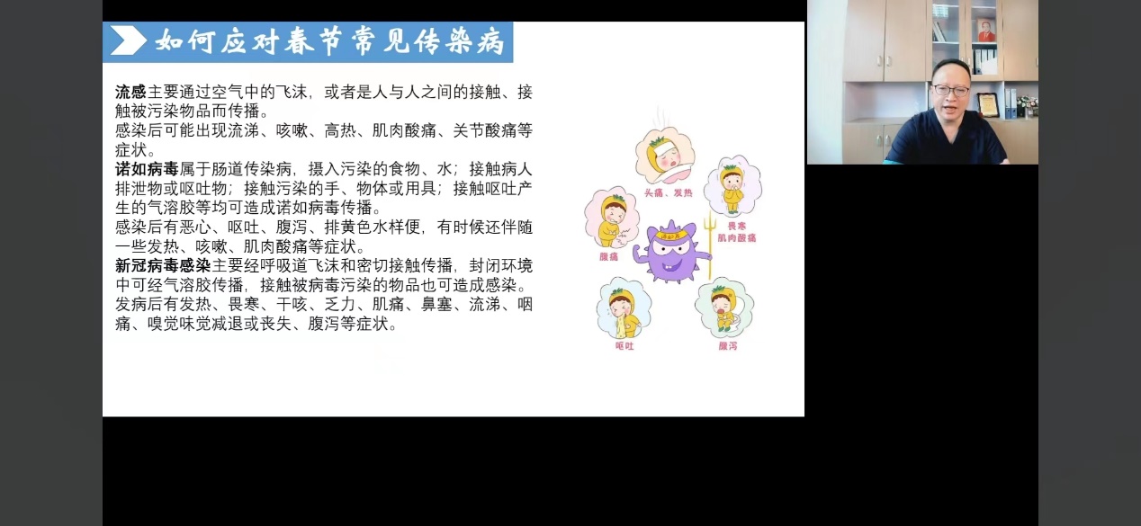 3月23日,永利集团88304官网孟勇教授为我校幼儿园师生、家长代表近500人带来“幼儿春季传染病及预防”为主题的线上科普讲座。孟教授围绕免疫力、病毒、传染病三个关键点,详细讲解了免疫力的形成机制、春季常见传染病应对策略、诺如病毒的防控方法,以创新、趣味、生动的形式进行医学健康科普知识的推广,将幼儿健康管理落到师生、家长实际行动上,让科普成为家校“定心丸”,成为幼儿健康“保护网”。