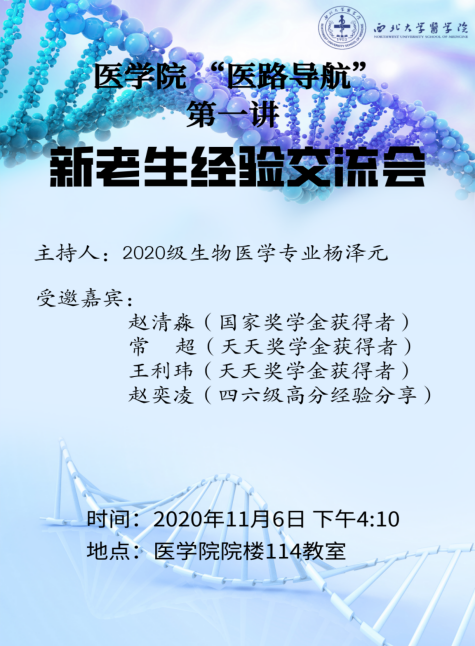 为帮助2020级新同学迅速适应大学生活、尽快融入永利集团88304官网大家庭,厘清医学生成长路线,进一步加深对医学使命担当的理解,明确未来学习生活航向,2020年11月6日,学院组织开展“医路导航”新老生学习经验交流活动,2019级优秀学生代表赵清淼、常超、王利玮、赵奕凌以“如何实现角色转变、适应大学生活”为主题向2020级医学新生分享学习经验。