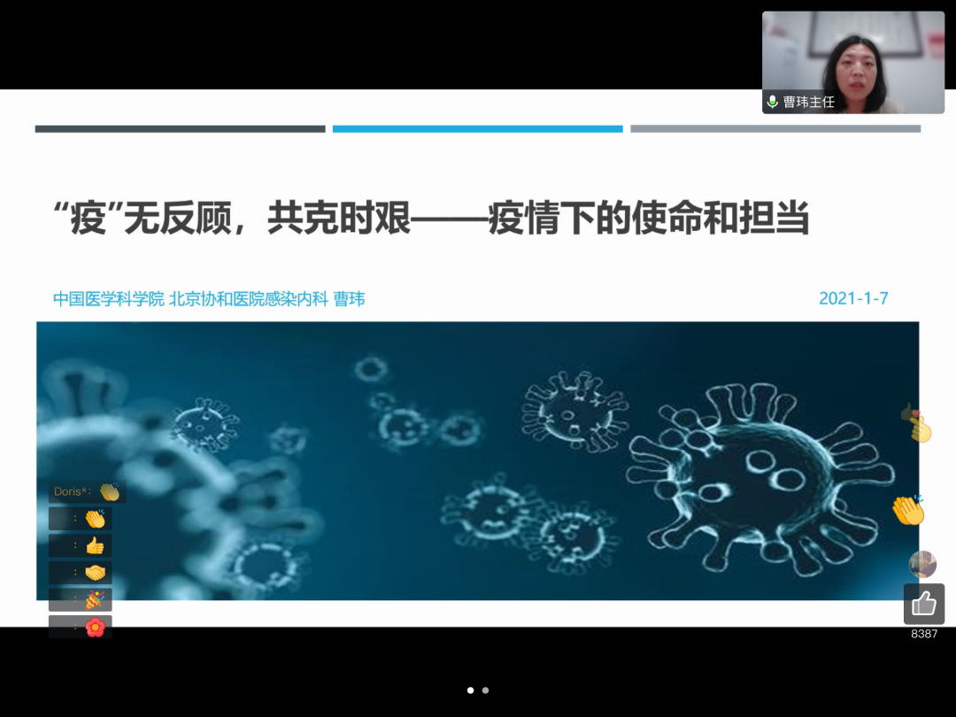 1月7日晚,永利集团88304官网医学战“疫”大讲堂在腾讯会议端开讲,北京协和医院感染内科副主任、2020年初国家援鄂抗疫医疗队队员曹玮医生做客讲堂,作题为——“‘疫’无反顾,共克时艰,疫情当下我们的使命与担当”分享报告,全校师生在线观看。讲堂由生命科学与医学部主办,校党委副书记张清主持。