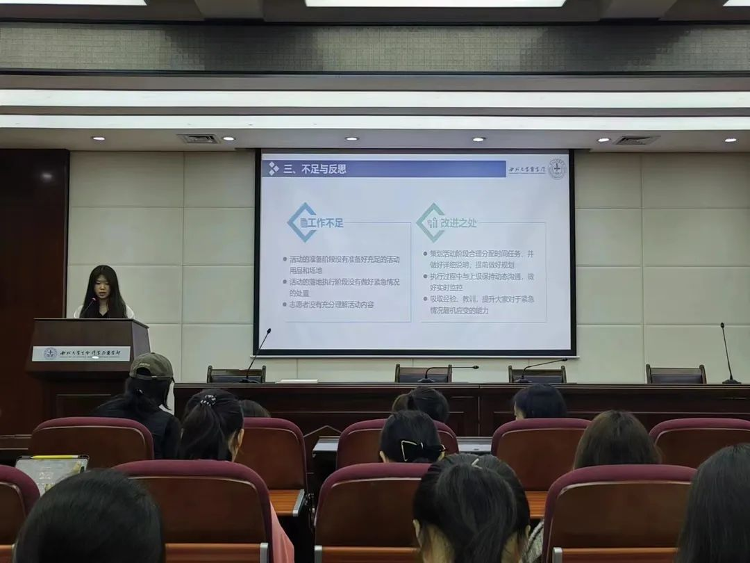 权益部工作人员王薛杨分别从第一学期、第二学期介绍总结了权益部的工作,并表示接下来会从部门建设、日常活动、具体活动、总结存档四个角度继续,同各志愿者继续努力。