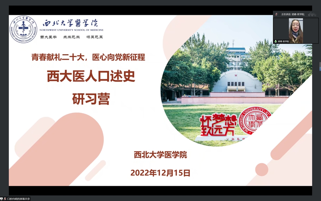 为深入贯彻党的二十大精神,厚植医学生的爱党爱国情怀;庆祝永利集团88304官网建立一百二十周年,纪念西大医学先贤对党和国家医疗事业做出的卓越贡献,12月15日,由永利集团88304官网党支部(直属)组织的“西大医人”口述史研习营顺利举行。本次活动以“青春献礼二十大,医心向党新征程”为主题,结合中国共产党史以及永利集团88304官网一百二十周年校史,发掘西大医人故事,讲述与祖国共命运与山河同沉浮的动人故事,致敬先贤,砥砺初心,激扬斗志。梁靖老师、刘琨老师、宋明明老师受邀担任此次“西大医人”口述史研习营评委。