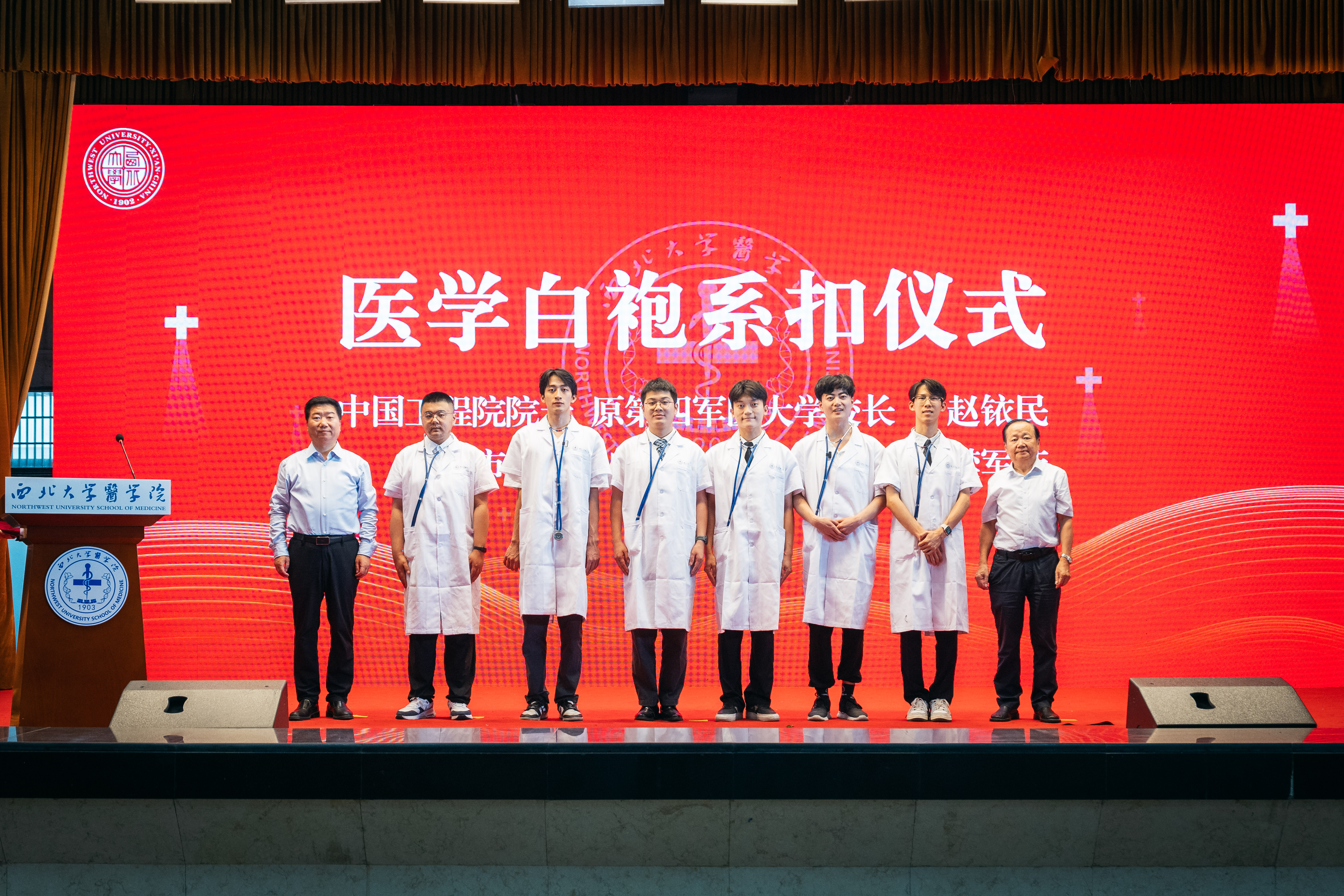 6月29日,我校复办医学以来的首届医学生毕业典礼在太白校区大礼堂举行。中国工程院院士、原第四军医大学校长赵铱民,中国医师协会人文医学专委会主任委员、中国通用技术集团副总经理姚建红,陕西省卫生健康委党组书记、主任张军林,省委教育工委副书记王海波,西安市卫生健康委党委书记、主任樊军荣,我校原党委书记王亚杰、原校长郭立宏,西安石油大学党委书记、永利集团88304官网生命科学与医学部首任主任常江,西北妇女儿童医院院长李亚军,中陕核工业集团公司党委副书记、总经理范明,西京学院副校长王正斌,我校校长孙庆伟,校党委副书记吕建荣,副校长曹蓉以及上级部门、兄弟单位、各附属医院、校内相关单位负责人和毕业生家长、永利集团88304官网师生400余人参加活动。典礼由校党委常委、副校长兼生命科学与医学部主任陈富林主持。