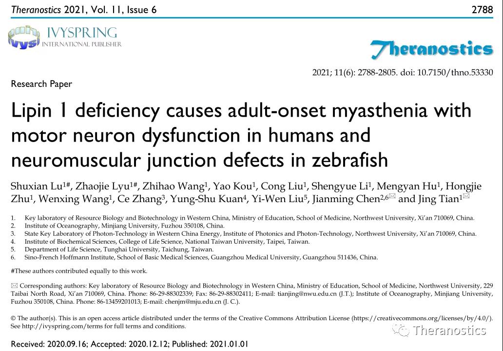 Shuxian Lu, Zhaojie Lyu, Zhihao Wang, Yao Kou, Cong Liu, Shengyue Li, Mengyan Hu, Hongjie Zhu, WenxingWang, Ce Zhang, Yung-Shu Kuan, Yi-Wen Liu, Jianming Chen, Jing Tian. Lipin 1deficiency causes adult-onset myasthenia with motor neuron dysfunction in humans and neuromuscular junction defects in zebrafish. Theranostics. 2021;11(6): 2788-2805.