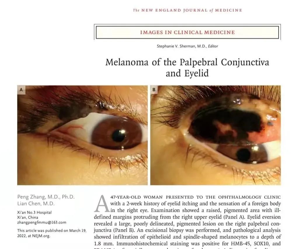 近日,全球最具影响力的临床医学期刊《新英格兰医学杂志》(2021年影响因子91分)刊登了永利集团88304官网附属医院·西安市第三医院眼科张鹏主任及陈莲主治医师的文章“Melanoma of the Eyelid and Palpebral Conjunctiva”(眼睑及结膜黑色素瘤)。