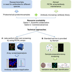本文的另一位作者,永利集团88304官网/Abmart公司王朝晖博士表示:“抗体是生物学和医学研究中必不可少的工具,如何能够高效率、低成本的开发抗体一直是抗体开发人员技术追求。通过超大容量抗体芯片技术,他希望能够让抗体开发不再成为科研人员的负担。”同时王朝晖博士也提到“近年来,各种形式的抗体药物成为了医药领域的最大热点。也希望通过抗体芯片技术,在新药靶点的筛选筛选方面和抗体药物先导分子的开发中发挥效率优势。”项目研究团队将开放抗体芯片技术平台给全球的科研工作者,合作方式如图5所示。