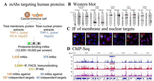 实验中研究人员为了证明抗体芯片的广泛应用性,首先用81个人与大肠杆菌随机来源的蛋白对PETAL芯片进行了筛选,证明了PETAL可以在较短的时间内(1-2周)以至少20%的成功率获得随机蛋白的高亲和力识别抗体。这也意味着对类似人这样含1万种以上蛋白的蛋白质组,PETAL有可能实现几千种蛋白的识别覆盖。为验证PETAL在蛋白组抗体开发上的可能性,研究人员提取几种人细胞系的膜蛋白组和核蛋白组,批量地筛选得到了149个膜蛋白单抗和55个核蛋白单抗,随后对这些抗体进行了严格的特异性评估并且证明筛选得到的单抗可适用于IFChIP-seq等多种应用(图2)。同时,研究人员也已经在超过10个物种(涵盖了病毒、细菌、真菌、植物、动物)上成功验证了PETAL可用于批量开发这些物种特异的应用抗体,因而PETAL有望为目前缺少抗体研究工具的多个物种提供一个批量抗体开发的解决方案。