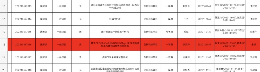 国家级项目《基于CRISPR/Cas9技术的KLGFP/p16RFP报告细胞系构建和抗衰老药物筛选》(项目组成员:徐云骅、赵文洁、杨雯铄,指导教师:余源)