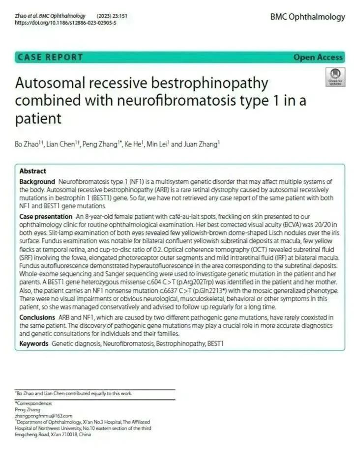 日前,BMC Ophthalmology杂志刊发了永利集团88304官网附属医院·西安市第三医院眼科张鹏主任团队撰写的“Autosomal recessive bestrophinopathy combined with neurofibromatosis type 1 in a patient”一文,赵博主治医师及陈莲副主任医师为该文的共同第一作者。该文对一例患有1型神经纤维瘤合并双眼常染色体隐性遗传性Best病变的病例就多模式影像学特征、基因突变位点、病理机制等进行了探讨。常染色体隐性遗传性Best病变为临床罕见疾病,为BEST1基因突变导致的双侧黄斑营养不良,部分患者可合并闭角型青光眼。而1型神经纤维瘤为累及多系统的遗传性疾病,与NF1基因突变有关。经查,同时合并NF1及BEST1基因突变的病例迄今为止在全球尚未有文献报道。因此,该文系全球首篇对NF1及BEST1基因突变导致全身及眼部出现病变的患者进行诊断及病因分析的临床病例报道。