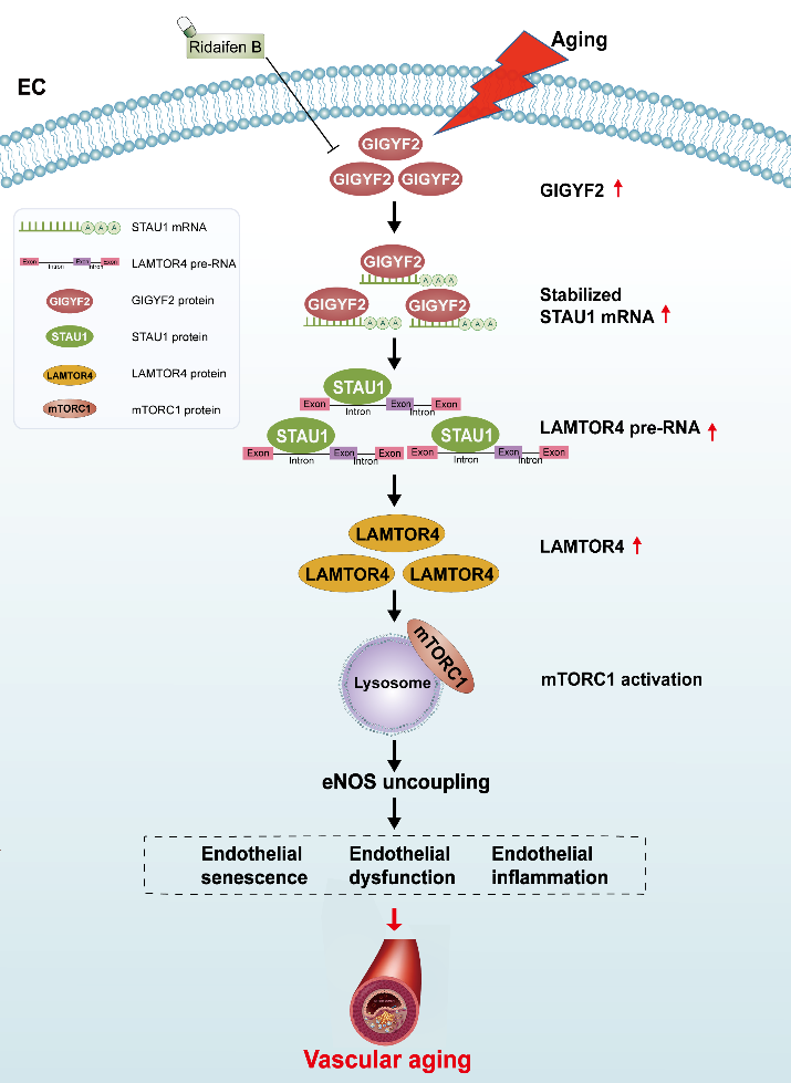 GIGYF2与衰老相关疾病的发病机制密切相关。该研究发现GIGYF2在衰老的人ECs和老年小鼠主动脉中异常高表达;在非衰老ECs中,过表达GIGYF2会促进eNOS解偶联、细胞衰老、内皮功能障碍和mTORC1-SK61信号通路的激活,而雷帕霉素(Rapamycin,RAPA)或抗氧化剂N-乙酰-L-半胱氨酸(N-Acetyl-L-cysteine,NAC)处理可抑制这一现象;剥夺STAU1能明显缓解GIGYF2诱导的年轻ECs衰老、功能障碍和炎症;GIGYF2作为一种RNA结合蛋白(RBP)可增强STAU1 mRNA的稳定性,而且GIGYF2-STAU1信号轴通过上调LAMTOR4表达促进mTORC1转位至溶酶体,从而驱动mTORC1-S6K1通路的激活;此外,在小鼠模型中,GIGYF2flox/flox Cdh-Cre+小鼠保护老年小鼠免受衰老相关的血管内皮依赖性舒张和动脉僵硬的影响。破坏GIGYF2-STAU1-mTORC1信号级联可能是应对血管衰老和衰老相关心血管疾病的一种有前景的治疗方法。