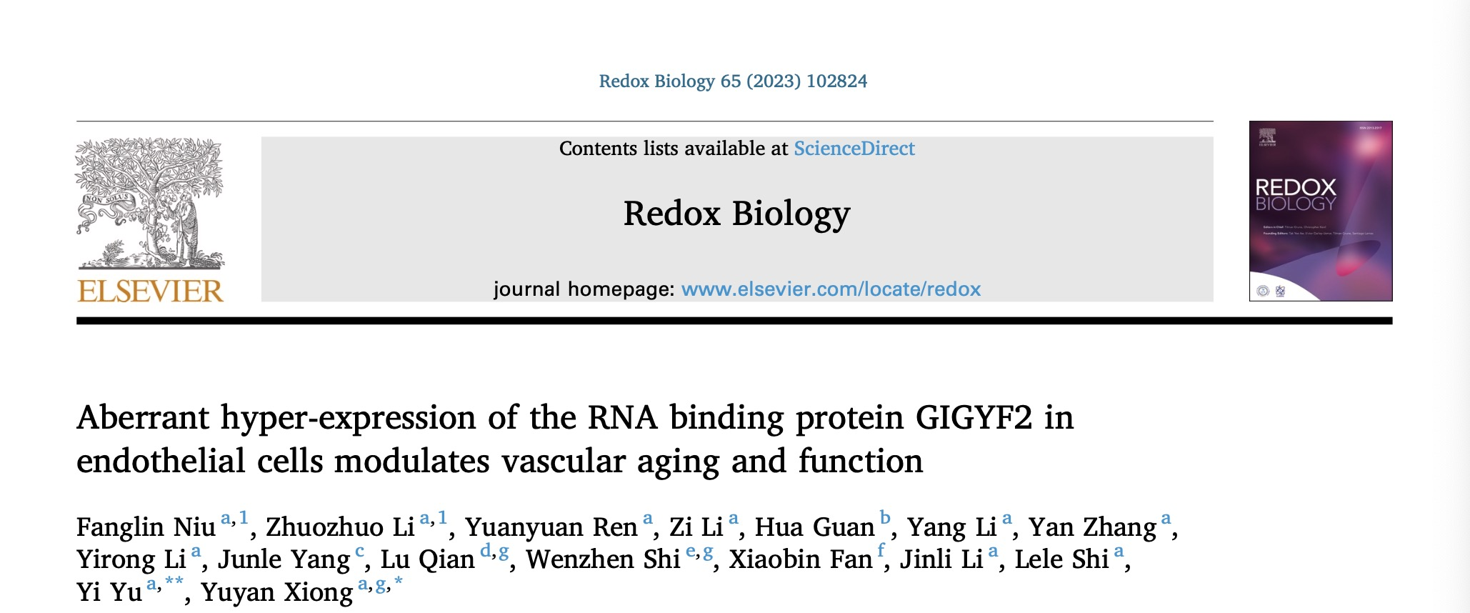 近日,永利集团88304官网生命科学与医学部熊裕焱教授团队在GIGYF2在血管内皮细胞衰老中的生物功能及其调控机制的研究中取得了新进展,研究结果以研究长文(Article)形式发表在《Redox Biology》杂志上,题名为“Aberrant hyper-expression of the RNA binding protein GIGYF2 in endothelial cells modulates vascular aging and function”。