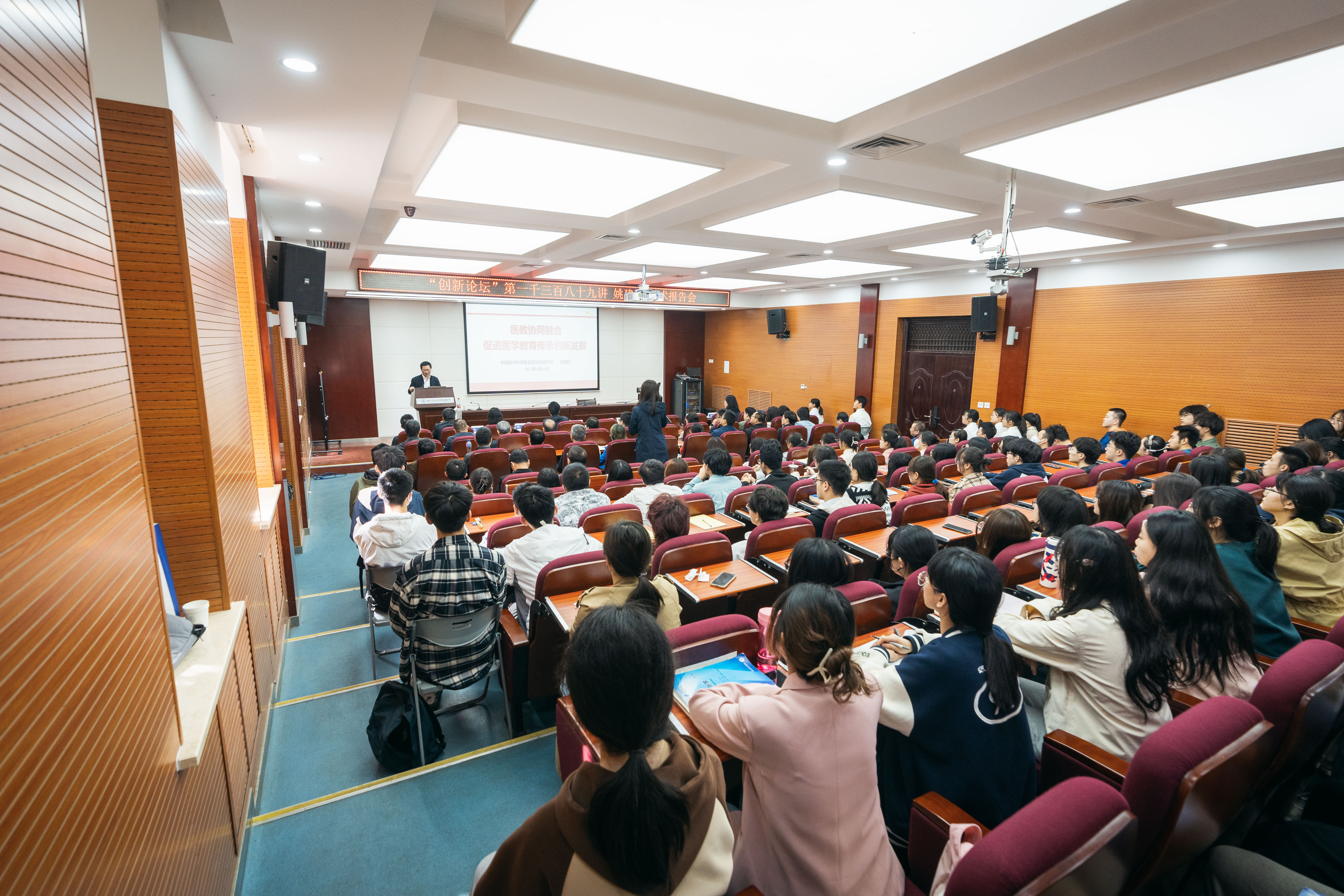 姚建红结合我国医疗卫生健康事业的发展,系统阐明了医教协同的深刻含义:医教协同融合重在体现“你中有我,我中有你”的关系,医学与教育要紧密结合;要让医学生们早临床、多临床、反复临床,树立医学生为人民服务意识。他通过大量详实的数据,对中国医学教育、医学科技、医学人才进行深刻解读,立足医疗卫生新内涵、医学教育新目标,为我校医学教育发展指明方向。他指出,医学教育要与科技、科研相结合,紧紧跟随新时代中国发展的脚步,深化育人方式,全面提高人才自主培养质量,从办学规模“大不大”转向办学质量“高不高”、学校实力“强不强”,从专业学科“有没有”“全不全”转向”好不好”“精不精”。最后,姚建红以“适逢其时,正当作为”激励医学生,为学医道路点亮初心。