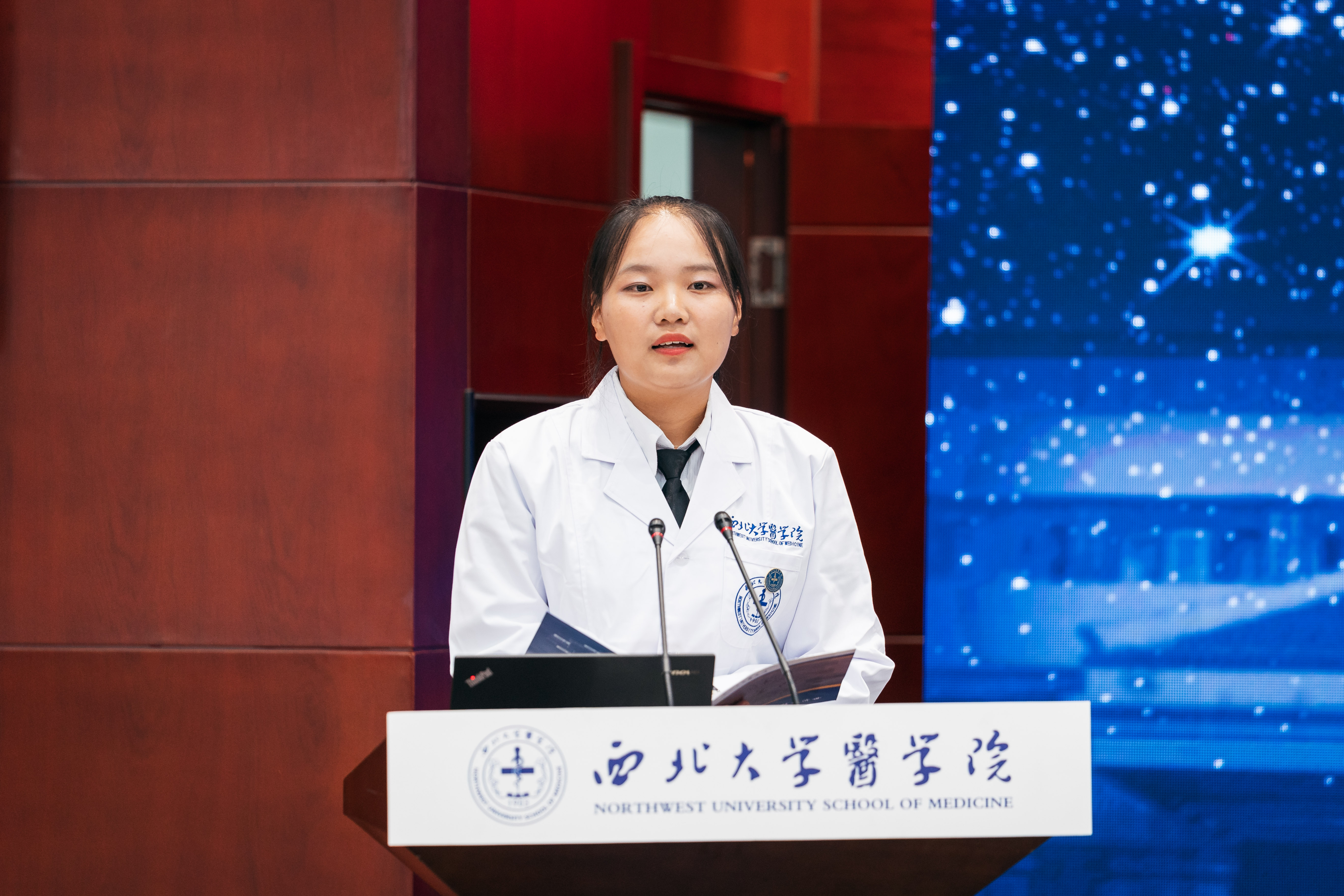 全体医学新生在我校附属第一医院医生王睿的带领下进行了庄严的医学生宣誓,将“维护医术的圣洁和荣誉”。