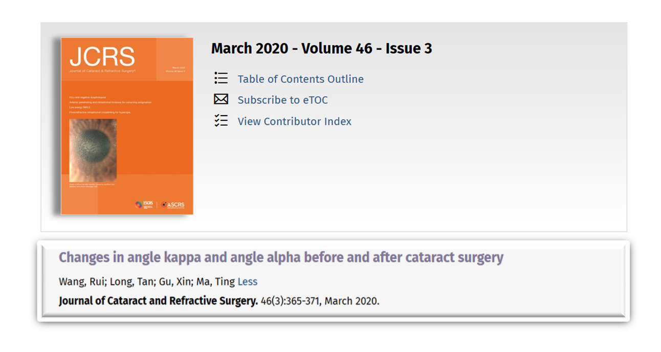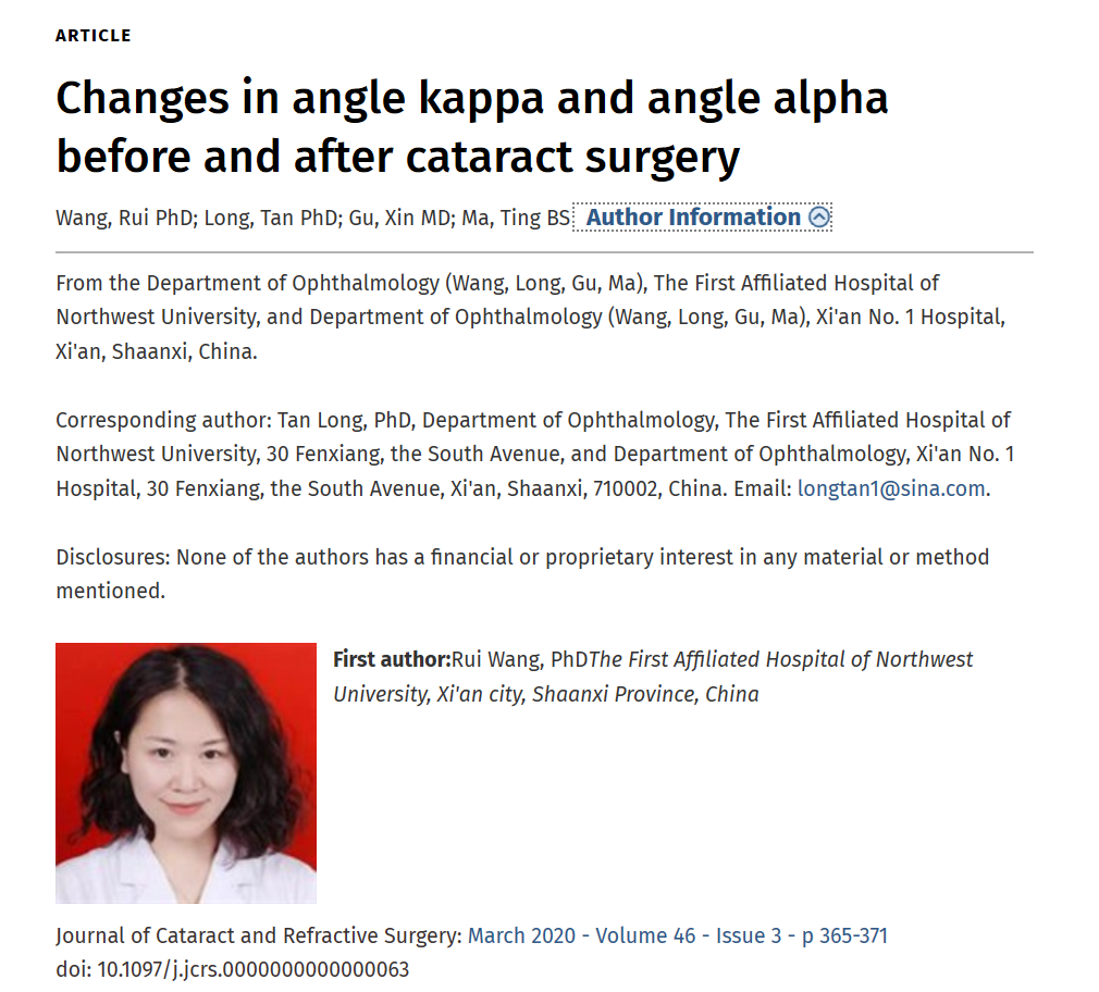 永利集团88304官网附属第一医院(西安市第一医院)自2010年开展屈光白内障手术,致力于为患者提供精湛的医疗技术和理想的手术效果,10年来为数以万计的白内障患者带去了全新的视觉体验。近期,中心屈光白内障团队临床研究成果发表于JOURNAL OF CATARACT AND REFRACTIVE SURGERY杂志。该杂志是美国白内障和屈光手术学会(ASCRS)和欧洲白内障和屈光外科医师学会(ESCRS)官方期刊,内容涵盖眼前段手术的各个方面,包括临床研究、实用技术、重要案例、评论及基础研究等。