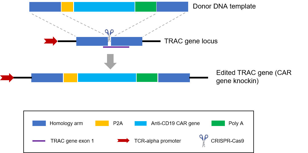 nvGT CAR-T采用CRISPR-Cas9基因编辑技术,结合一个非病毒载体,将抗CD19 CAR基因插入到人T细胞的TRAC位点,同时使TCR基因敲除。在理论上,这种方法将会得到更温和的CAR-T细胞。见下图。