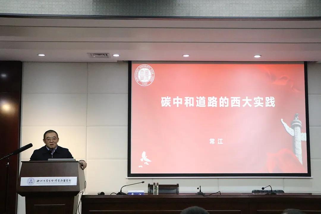 在授课中,常江先是围绕着“双碳目标”向师生科普了“碳达峰”和“碳中和”,阐释了“碳达峰”与“碳中和”的关系、气候变化的危害以及“双碳目标”的提出在国际国内引发的反响。他强调,“双碳目标”的提出是习近平生态文明思想、人类命运共同体思想的升华和延展,是国家层面的战略选择。随后,常江从双碳目标背景、CCUS技术简介以及碳中和道路的西大实践三个方面进行了详细讲解。他以永利集团88304官网18年来参与CCUS工作的奋斗历程为切入点,向大家介绍了西大在CCUS领域提出的西大方案、创造的西大智慧、实现的西大创新,生动阐述了西大人服务应对气候变化战略需求的具体实践。最后,常校长回顾了他亲身参与学校医学复办、“大部制”改革的过程,表达了他对生命科学与医学部的深切情怀,并勉励师生们要传承薪火、勇担使命、珍惜当下、接续奋斗。