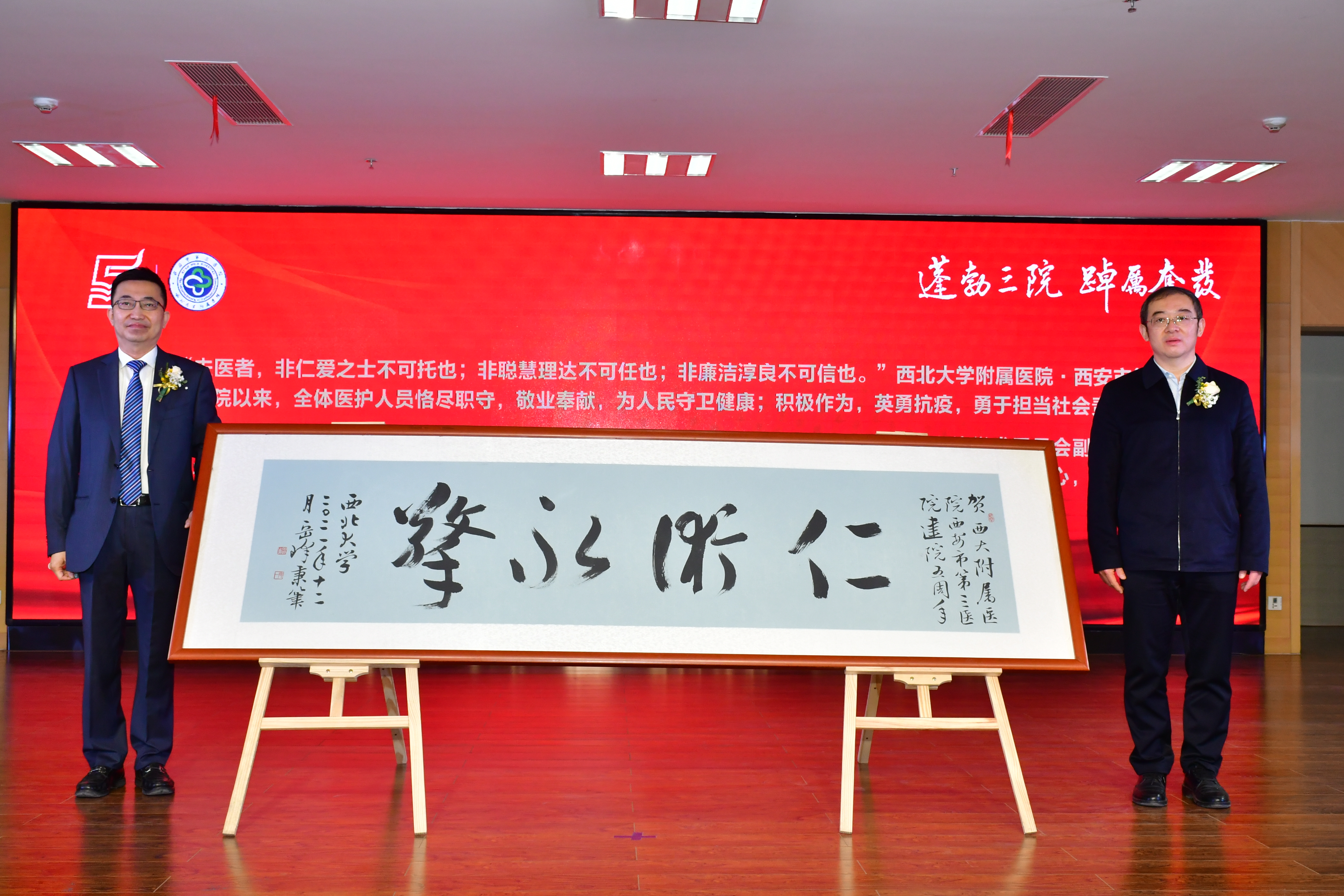 常江代表学校参加了医院二期建筑主体封顶仪式,并在院庆大会上赠送了题有“仁术永擎”的书法大卷作为贺礼,砥砺医院全体同仁铭记初心,厚德怀仁,祝愿医院蓬勃发展,为增进人民健康福祉作出新贡献!陈富林在致辞中表示,校院合作以来双方通过深度融合共建,取得了丰硕的成果,成为医教研合作的成功典范。他期望,通过学校和医院的不断融合、创新发展,为“教育强市”和“健康西安”建设贡献更多的西大智慧和西大力量,推动医院加快建成具有国际影响力、国内竞争力、区域带动力的高水平区域医疗中心。