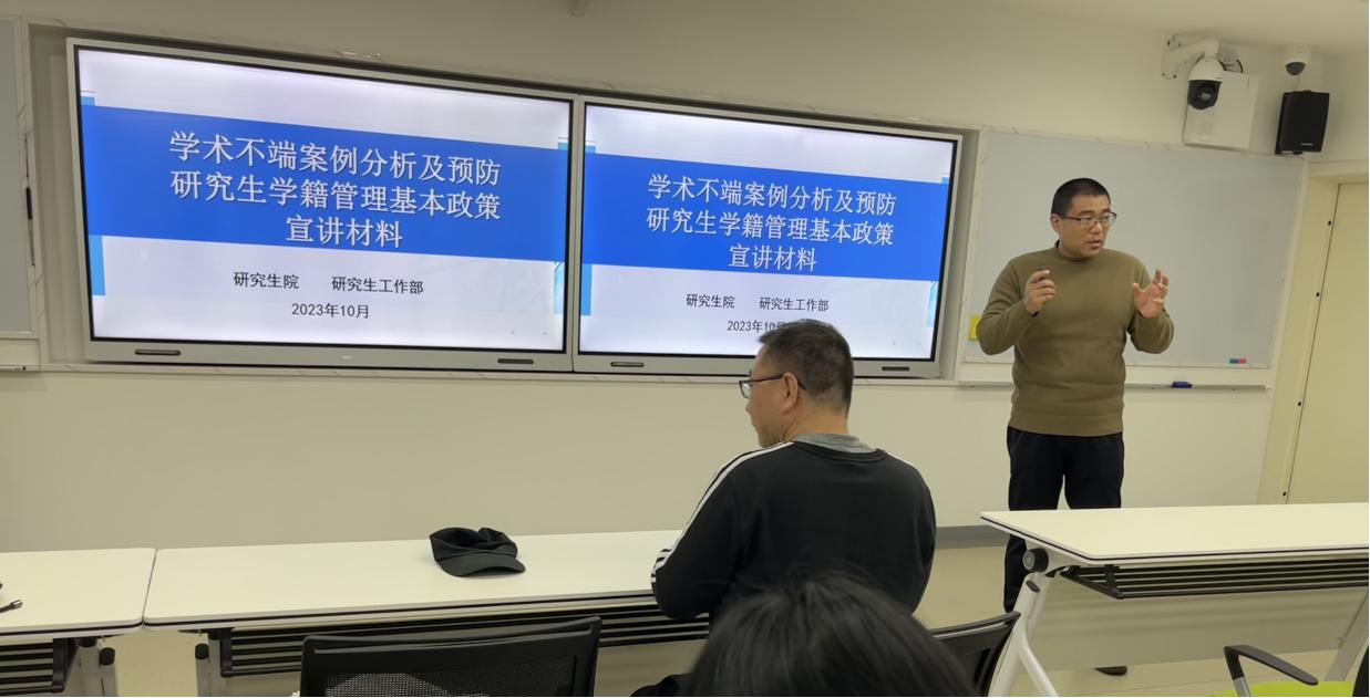 王全伟以“学术不端案例分析及预防”和“研究生学籍管理基本政策”为主题,对国家、学校有关文件精神进行了解读,同时结合案例及相关数据分析列举了学术不端行为的种种表现,强调了“零容忍”的态度,要求同学们坚守学术道德底线、恪守诚信原则。