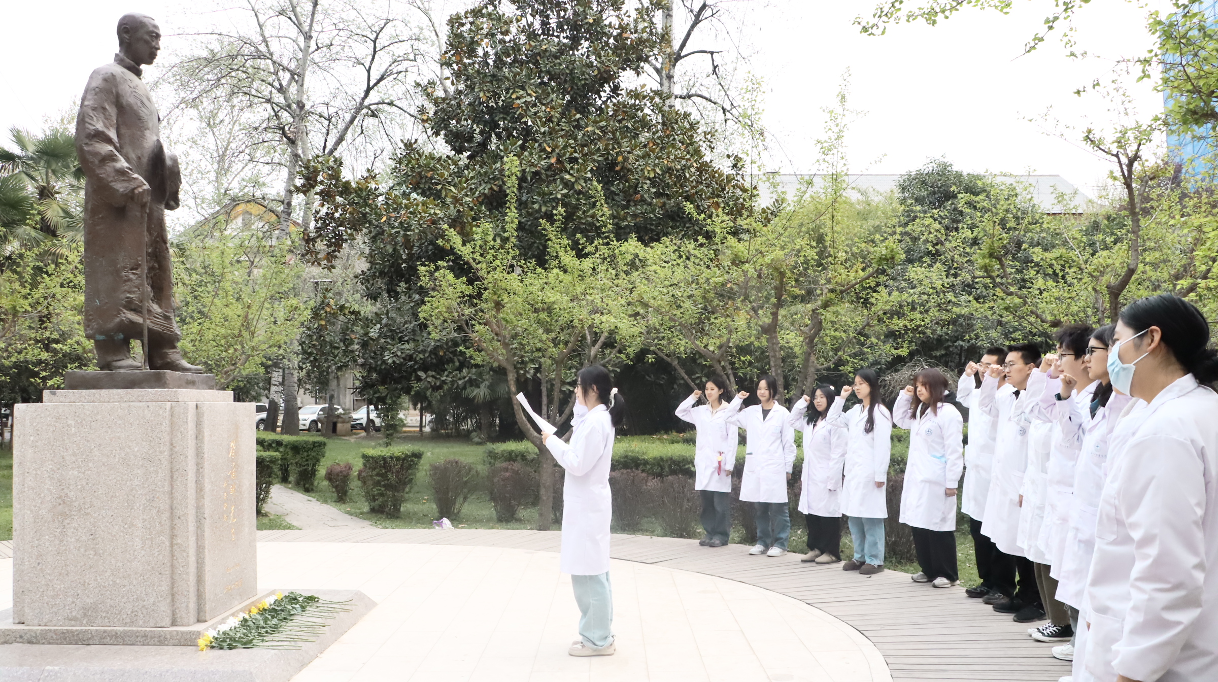 活动现场素花环绕,徐诵明先生的全身雕像肃然矗立。仪式在庄重的氛围中开始。师生代表缓步上前,向雕像献花并致敬,表达对先贤的追念。学生代表带领现场师生回顾了徐诵明先生作为中国现代医学教育开拓者的毕生追求,强调其“教育救国、医学报国”的信念对当代医学人才培养的深刻启示,以徐诵明先生抗战时期临危受命、重建西北永利集团88304官网的事迹为例,勉励师生“将爱国情怀融入医学实践,以仁心仁术守护人民健康”。全体师生高举右拳重温《医学生誓言》,“健康所系,性命相托”的铿锵誓言在校园久久回响。‌