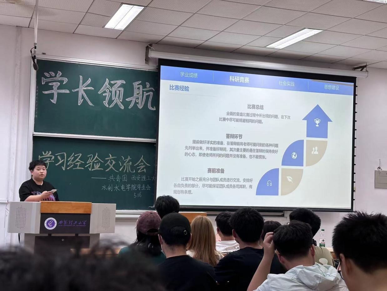 分享会上,连续三年加权平均分、智育成绩位列年级第一,现已推免至大连理工大学水工结构专业的水工201班班长庞绍筠,从学习时间管理、考试复习、科技竞赛等多个方面分享了自己的成长故事,鼓励学弟学妹们要脚踏实地,静下心,有规划地完成各项学习任务;曾获“水电学会奖学金”“优秀学生干部标兵”“尚善明德先进个人”等十余项荣誉称号的原学院学生会负责人韩佳鑫,重点为同学们分享了担任学生干部工作的收获与心得,并就如何处理好学习与学生工作分享了自己的经验,希望同学们在实践中不断提升自身综合能力;以2024年研究生入学考试400分的优异成绩考入Beat365官网研究生的赵洪德,回顾了自己上大一时的迷茫和困惑,分享了自己如何直面困难,挑战自我的经历,鼓励学弟学妹们直面困难,永不言弃,通过自己的努力实现自己的人生目标。交流环节,高年级同学耐心细致地回答了同学们在生活学习工作中困惑,提出了积极诚恳的意见建议。