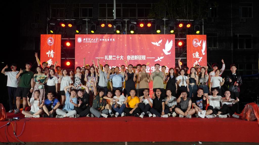 伴随着大屏幕上播放的2023届本科毕业生在大一入校时的精彩留影,晚会在一首充满温情的《夏天的小城》中拉开了序幕。随后,学院院长郭鹏程上台致辞,通过“志存高远、立足水利、脚踏实地”表达了对于2023届毕业生的祝福和期望。晚会节目异彩纷呈,轻松欢快的歌曲串烧《永远18岁》、动感十足的流行舞《talk that talk》、19级班长联合出品的光影剧《青春会落幕,我们不散场》,讲述了学子们在校学生生活的情景再现,19级党员代表热情高昂的演讲《不一样的年代,一样的青春》、《请老师放心》,伴随着毕业班导师殷殷寄语的手语操表演《同在一片蓝天下》、激情四射的乐队演唱《你要跳舞吗》、《无人的海边》,2023届毕业班辅导员合作演唱的《想去海边》、《光阴的故事》,表达了辅导员队伍对毕业生的祝福、歌曲《开往早晨的午夜》、《你曾是少年》、《那些年》、《千里之外》娓娓道来,让毕业生同学们更加珍惜时光、感恩母校、珍视友谊;晚会在校歌《春华秋实》中落下帷幕,全体演职员登台合唱向台下的毕业生们挥手致意,传递着不舍、表达着祝愿。整场晚会精彩纷呈,现场灯光璀璨、气氛热烈、欢声雷动,师生好评如潮,高潮迭起,取得了圆满成功。同时,现场也为毕业生发放了学院精心制作的刻画着教四楼的文创袋及代表着学院精神传承的徽章等,仪式感满满。