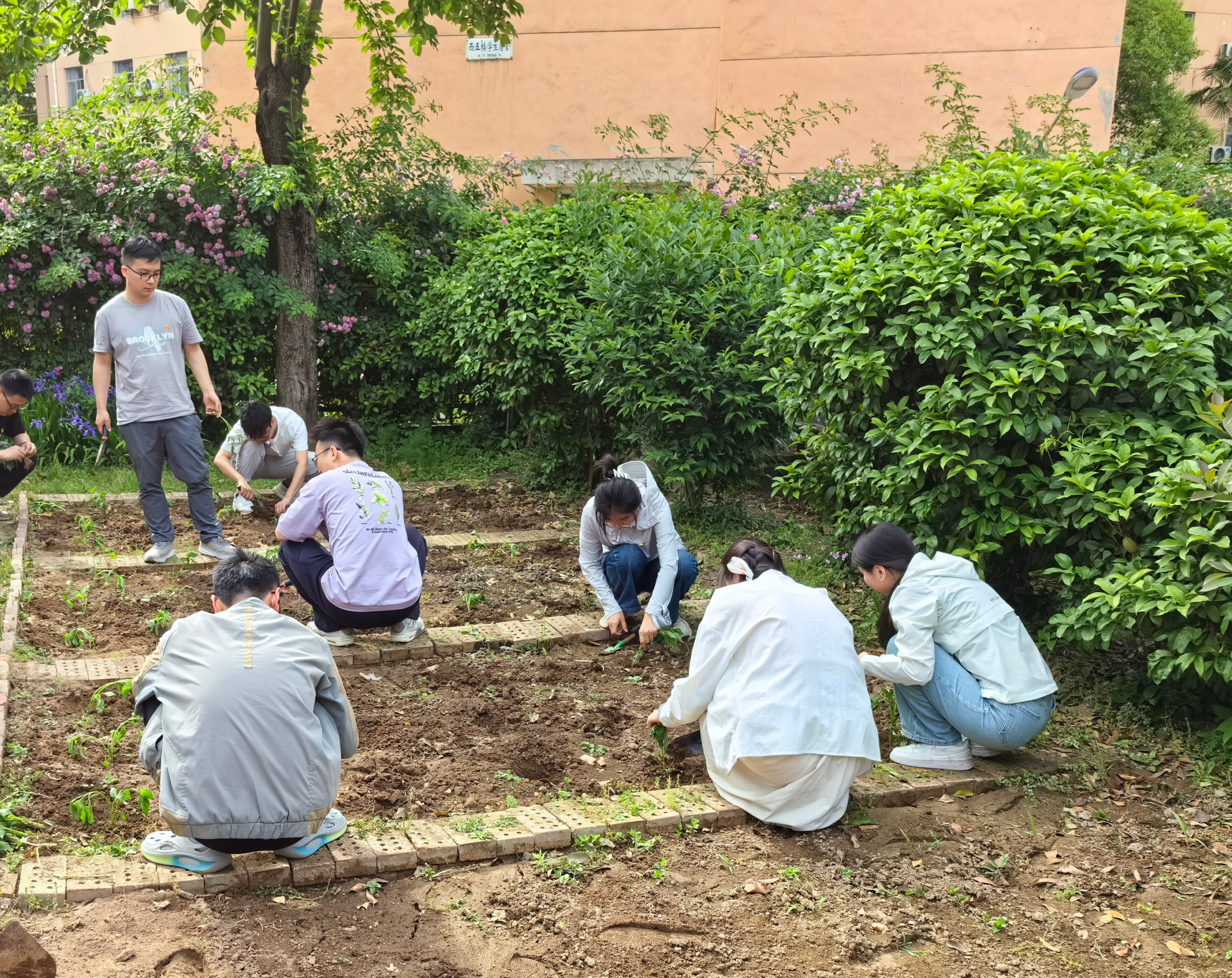 活动伊始,专业人员向同学们讲解茄科植物特性,演示翻土、垄沟、定植等技巧。随后,同学们分组协作,挥锹培土、精准定苗,在规划区域内完成“茄子两列七株、辣椒三列七株”的种植任务。尽管骄阳灼热,但同学们的身影始终忙碌在地头,汗水浸透的衣衫与嫩绿的秧苗相映成趣,绘就校园独特的劳动图景。