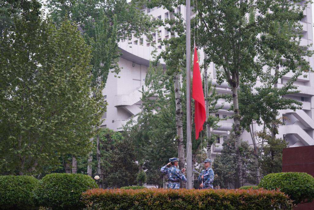 早上7时,国旗护卫队员迈着整齐的步伐,护送国旗入场,伴随着激昂雄壮的《义勇军进行曲》,鲜艳的五星红旗冉冉升起。全体师生肃立,向国旗行注目礼,表达对伟大祖国的无限热爱和崇高敬意。