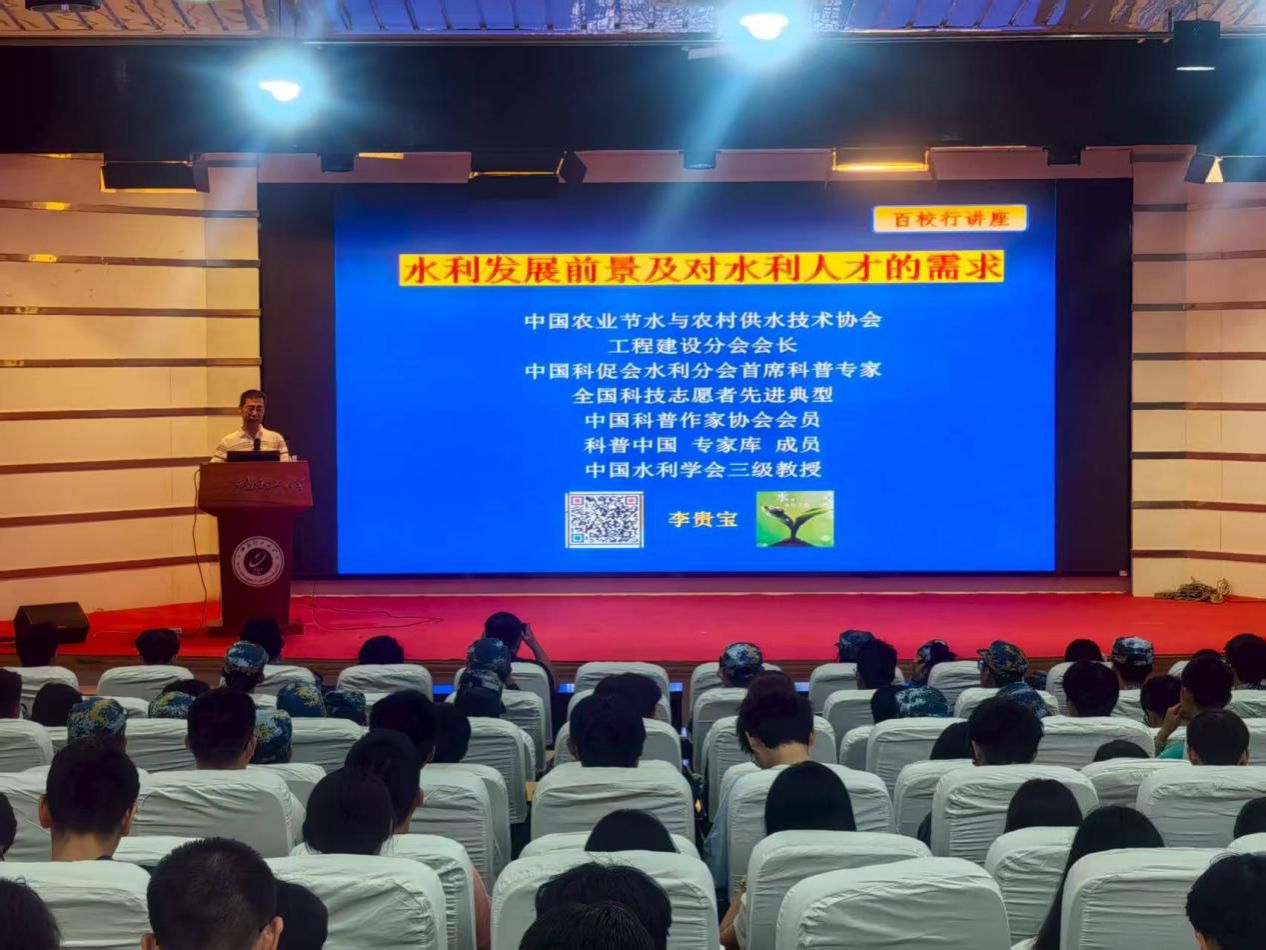 报告会上,李贵宝从“涉水管理”“水利发展前景”和“对水利人才的需求”三个方面展开系统阐述。他结合我国水治理体系现代化进程,分析了当前涉水管理面临的挑战与机遇,强调依法管水、科技兴水的重要性。随着国家水网建设、智慧水利推进和低碳转型需求日益凸显,水利事业正迈向更高质量、更可持续的新阶段,水安全战略地位不断提升,行业需要既懂传统水利又掌握信息化、生态化技术的复合型人才,他鼓励同学们夯实专业基础,拓展跨学科视野,提升实践创新能力,积极适应行业数字化转型和绿色发展新要求。