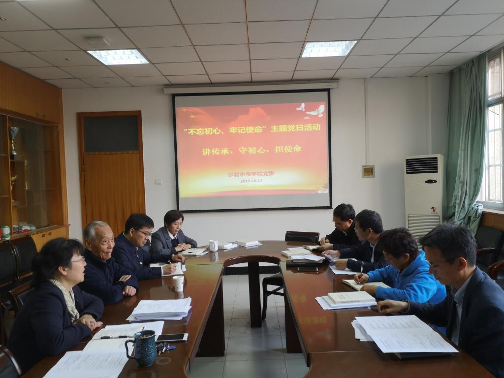 随着讲述的深入,时间慢慢来到了院班子成员刚刚步入水院的年份。回忆起第一次走进课堂,第一次聆听教诲,第一次加入实验,班子成员像找到了打开话匣子的钥匙一样,纷纷追忆起了他们的初心。下课后一定会擦掉黑板,讲授时一定会亲切询问,实验完一定会检查关灯,老一辈水利人对待工作严谨入丝的态度和外化于行爱校如家的情怀,都在不经意间点燃了班子成员们心中矢志教书育人的星星之火。“接过他们的使命,扎根水利,为党和国家的科研教育事业而不懈奋斗”,成为班子成员最坚定的追求,而“不忘初心、牢记使命”也在这一刻得到了最为生动而真实的体现。