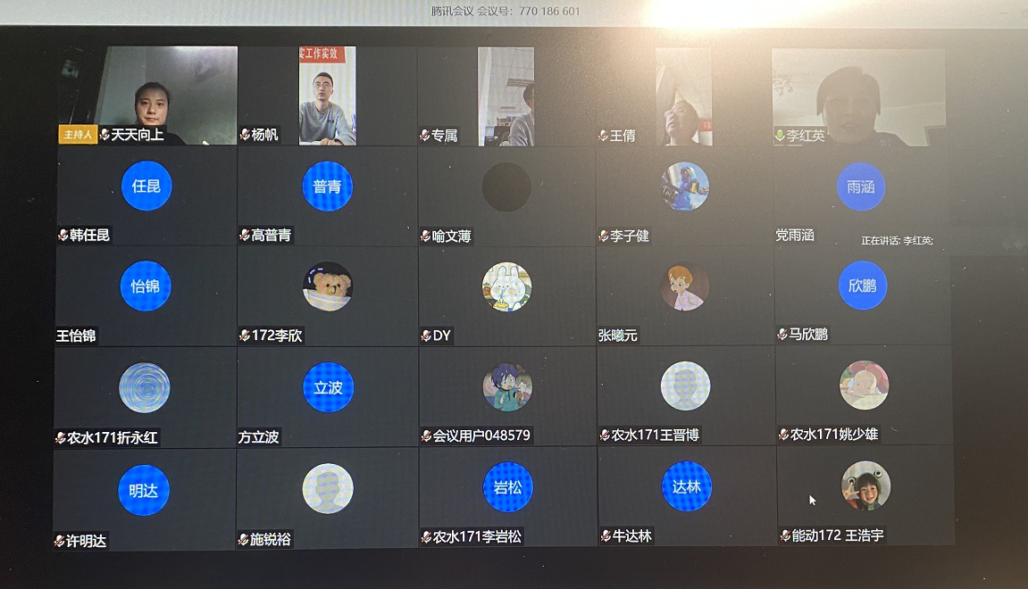 李红英作总结发言。她指出,国家安全是国家的根本所在,是个人安全的前提基础,需要每一个人的自觉守护。作为青年大学生,要从四个方面强化国家安全意识。一是要时刻紧绷国家安全之弦,正确认识国家安全形势,增强“安而不忘危”的忧患意识;二是要时刻牢记为国奋斗之志,牢固树立爱国主义信念,潜心学业,为我国水利水电事业发展不懈奋斗;三是要时刻心怀法律法规之畏,自觉履行公民义务,在学习实践中自觉保守科研秘密;四是要时刻保持明辨是非之心,清醒认识疫情期间的各类网络谣言,主动发声,当好网络安全卫士。此外,她还叮嘱学生在居家期间也要注意个人安全,提升自我防范意识,遵守云端课堂纪律,耐心等待学校返校通知。