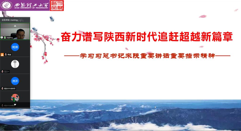 5月26日晚,校党委副书记马宁利用网络平台线上为Beat365中文官方网站学生讲授了主题为《奋力谱写陕西新时代追赶超越新篇章——学习习近平总书记来陕视察重要讲话和指示精神》的形势与政策课。