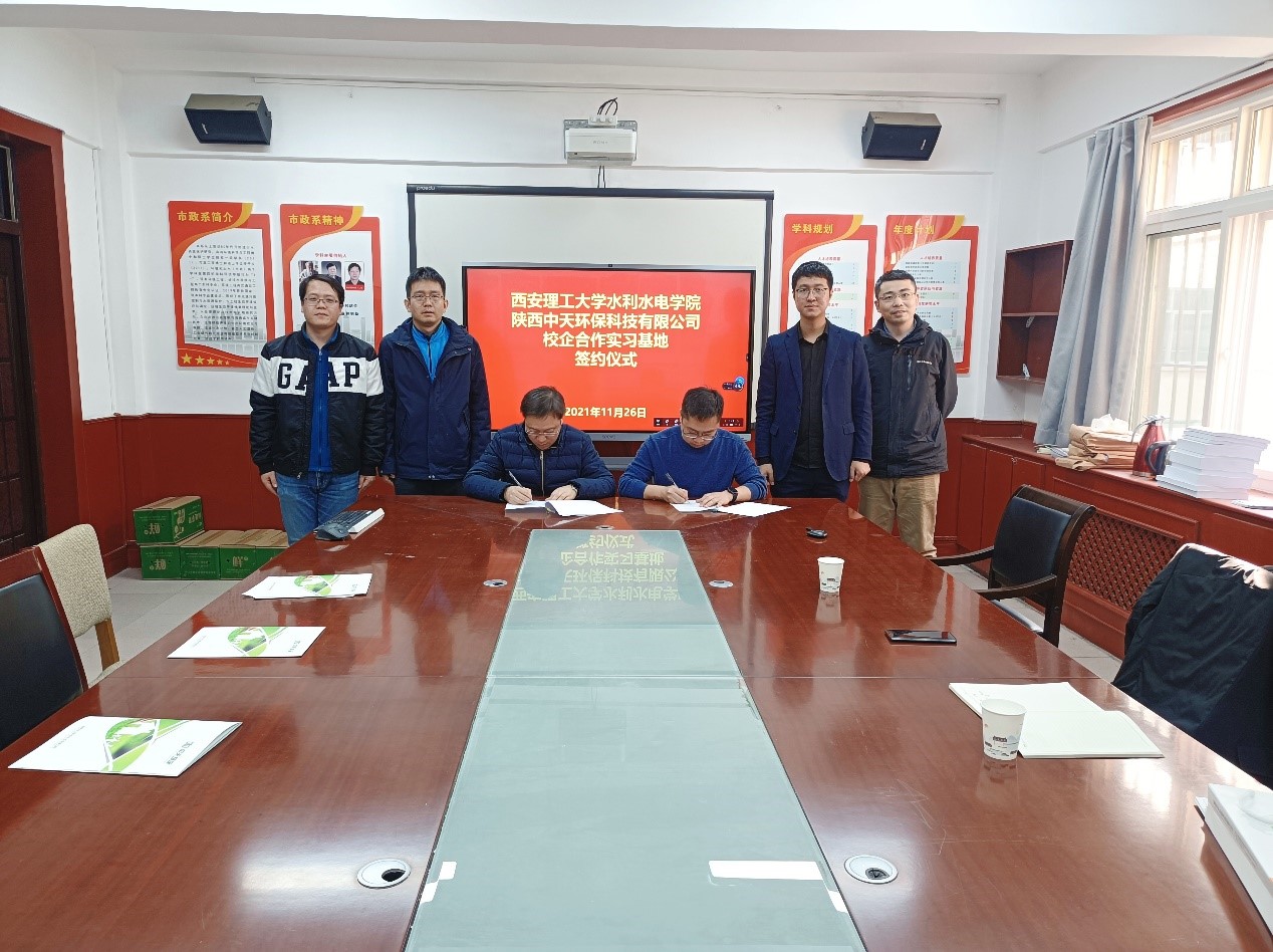 2021年11月26日下午,Beat365中文官方网站与陕西中天环保科技有限公司交流合作会议暨实习基地签约仪式在市政与环境工程系会议室举行。水电学院副院长吴罗长、市政系副主任王东琦、张耀中,以及中天环保公司总经理李岩等出席了本次会议。