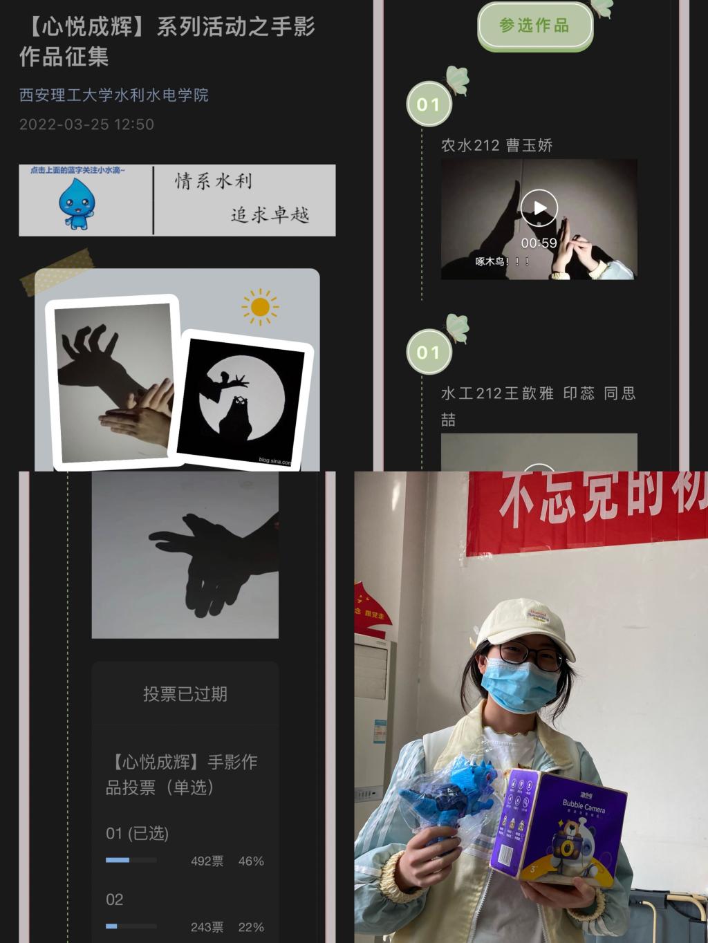 创意手影征集活动一经推出便引起了学生们的热烈讨论,激发了学生们的创作热情,在同学们之间搭建了一座沟通的桥梁。经过同学们的精心设计和巧妙设计,本次活动共收到15份作品,通过线上作品展示和投票,共计收到1751次投票,最终投选出一二三等奖。经过二十多日的作品创作投稿评选,活动在同学们的积极参与中圆满收官。