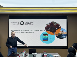 Brent Clothier为参会师生做了题为“Sustaining agriculture by valuing and protecting groundwater”的报告,报告从中国与全球相比在粮食生产中对地下水的依赖程度,阿联酋在地下水管理和替代水资源利用方面采取的措施,以及不同海水淡化技术的能耗差异这三个问题入手引出全球开展“粮食-水-能源”研究的重要性,并明确了零液体排放(ZLD)淡化技术在水资源短缺与环境保护的双重压力下,将成为协调“粮食-水-能源”关系的关键技术之一。因此科研学者应将目光放长远,尤其在水资源短缺且生态保护要求高的区域,更应综合考虑资源回收、环境风险及综合运营成本等多种因素。报告后,Brent Clothier以团队研究生在阿联酋极端干旱区开展的研究为例,介绍了如何构思科学论文撰写思路,以及如何确定研究内容、选择期刊,重要内容撰写注意事项,提高论文接收成功率。