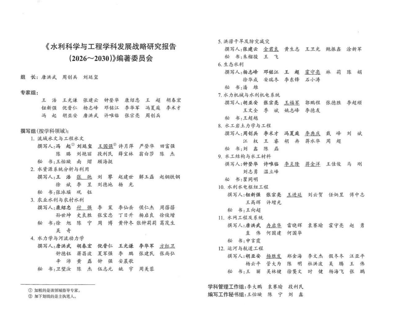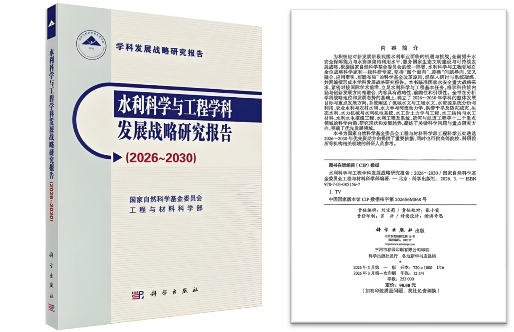 近日,由国家自然科学基金委员会工程与材料科学部编著,科学出版社出版的《水利科学与工程学科发展战略研究报告(2026-2030)》正式出版。
