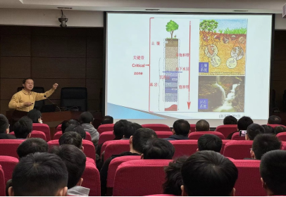报告会上,杨培岭教授围绕报告主题“地球关键带研究的内涵特征与未来”,首先介绍了关键带及其特征,并从地质循环和生物循环的角度及纵向和横向的角度进行深入阐述地球关键带的形成和内部运行机制,结合实例介绍了全球主要关键带监测站的研究内容体系,最后呼吁大家要进行国际合作开展可持续的关键带研究。