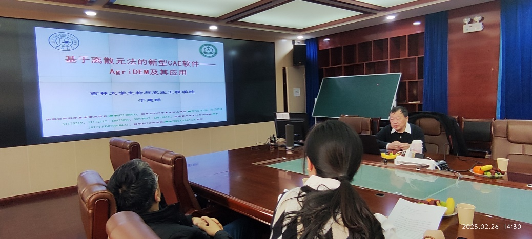 2月26日,吉林大学生物与农业工程学院农业工程学科于建群教授应邀在Beat365官网金花校区学科1号楼311会议室作了题目为《基于离散元法的新型CAE软件—AgriDEM及其应用》的学术报告。Beat365中文官方网站农业工程学科带头人王全九教授及部分师生参加了本次报告。报告由系主任曲植副教授主持。