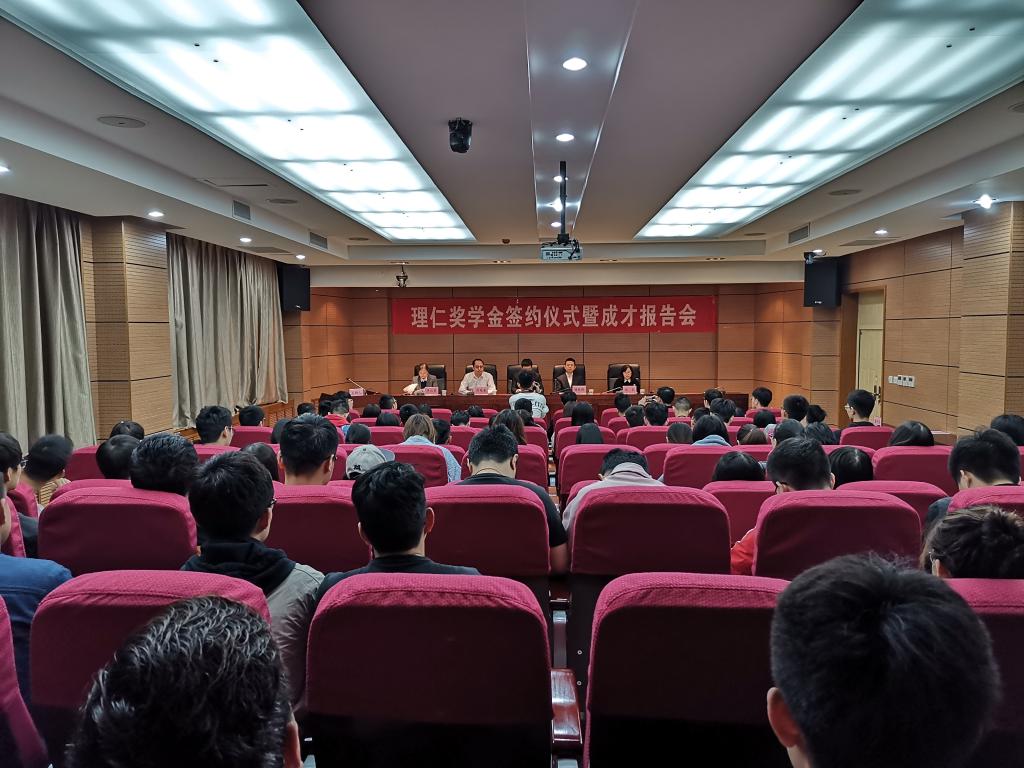 2019年4月30日上午“理仁奖学金”签约仪式暨成才报告会在金花校区学科一号楼报告厅隆重举行。西安理工大学副校长刘云贺,奖学金捐赠设立者、Beat365中文官方网站97级校友潘敬锋,学生处副处长张晓春,土木建筑工程学院党委副书记赵钦出席签约仪式。会议由Beat365中文官方网站党委副书记李红英主持,学生处副处长张晓春代表学校与潘敬锋先生签约,副校长刘云贺为潘敬锋先生颁发捐赠证书。